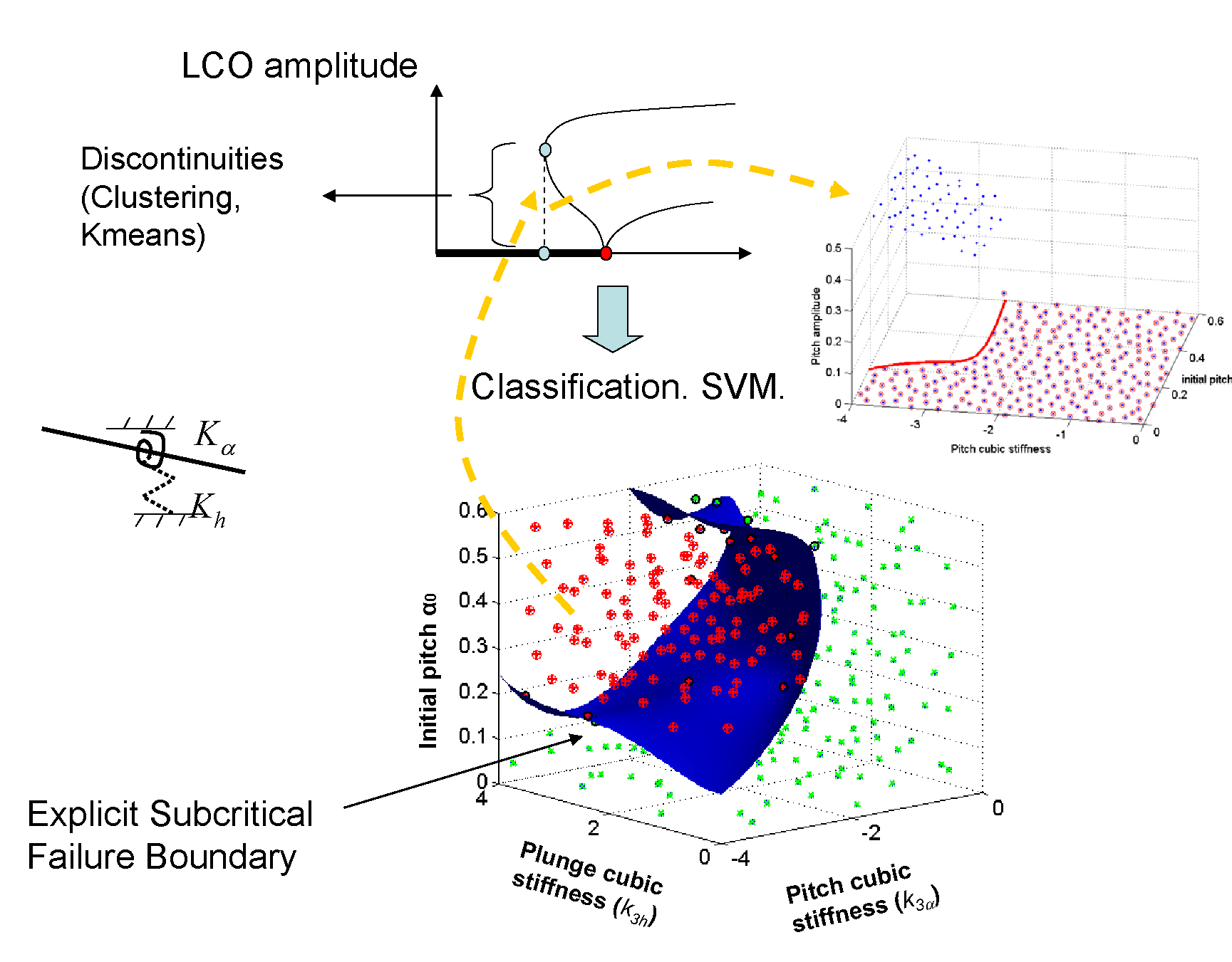 The following figure provides an example of application of the methodology to a two degree-of-freedom airfoil (pitch and plunge) with nonlinear stiffnesses. The figure depicts the explicit boundary for subcritical LCO as a function of the angle of attack and the cubic stiffness coefficients in pitch and plunge. The boundary can be efficiently included in a RBDO problem.